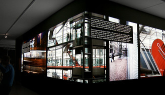 ZDF Mediabar – Interactive exhibits. three tellies, a kicker and 20 x red green showcasing the history of the ZDF.